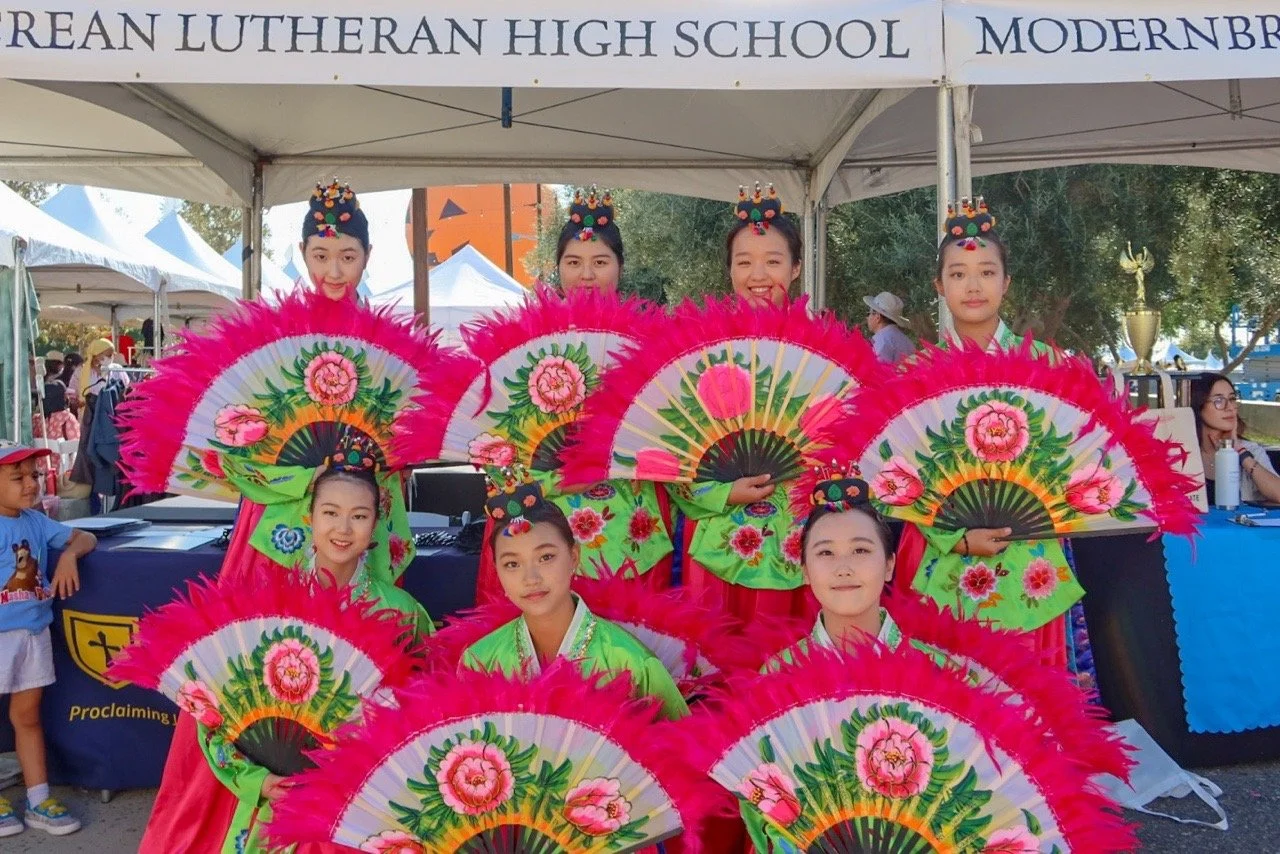 • A group of nine people in vibrant traditional Korean hanbok stand in front of a Korean-themed backdrop. The mood is festive and cultural outdoors.