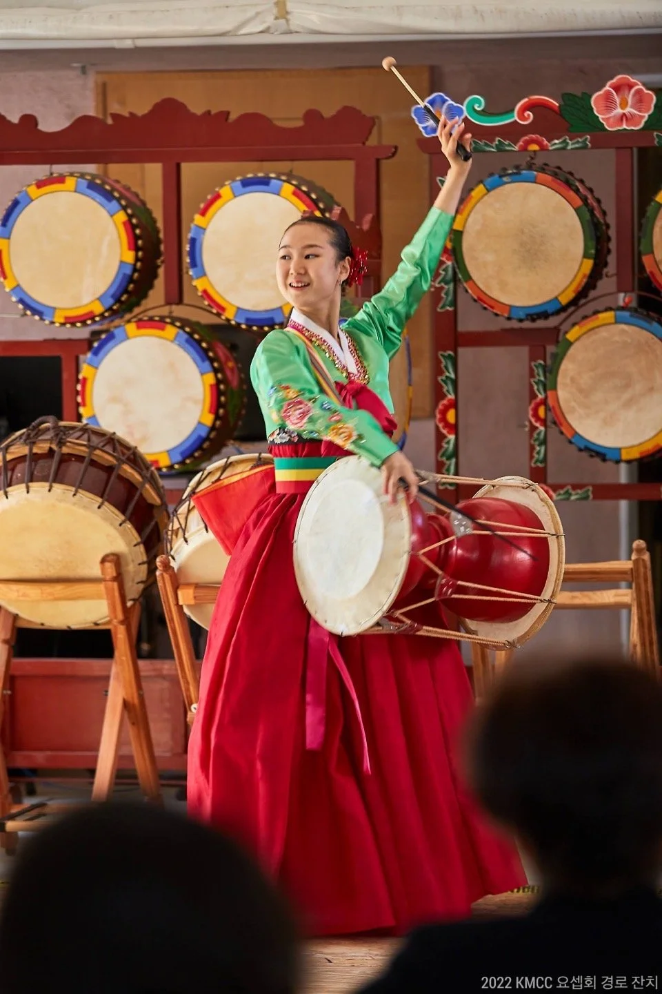 A performer in traditional Korean attire energetically plays a drum, smiling amid colorful, decorative drums in the background, conveying joy and cultural heritage.